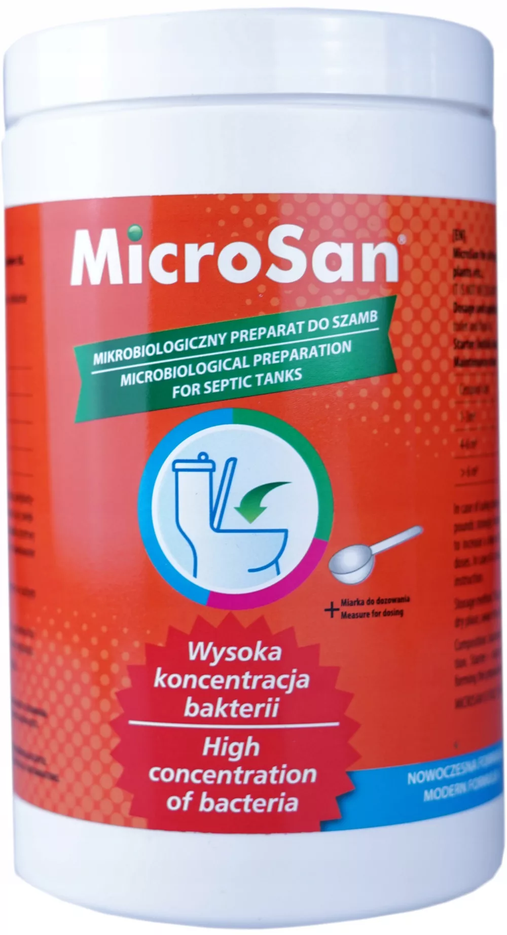 Microsan zawiera wyspecjalizowane mikroorganizmy, które przyspieszają rozkład resztek organicznych (nieczystości, papier, resztki roślinne oraz tłuszcze).