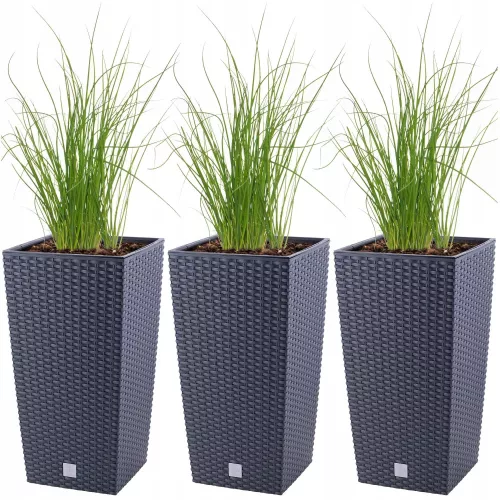 Zestaw doniczek Rato Square składa się z trzech doniczek o wysokości 37,6 cm. Te eleganckie, wysokie doniczki zostały wykonane z wytrzymałego, mocnego tworzywa sztucznego wyglądem przypominającego rattanową plecionkę. Mają nowoczesny, minimalistyczny i zwężany ku dołowi kształt. Są wytrzymałe na czynniki atmosferyczne i niezwykle łatwo utrzymać je w czystości - wystarczy przetrzeć zwilżoną szmatką. Doskonale wyglądają nie tylko w ogrodzie, na balkonie czy na tarasie, ale równie świetnie sprawdzą się jako dekoracja salonu, przedpokoju czy sypialni. To najlepszy sposób na wyeksponowanie swoich ulubionych roślin. Do każdej z doniczek dołączony jest specjalny wkład dystansowy, dzięki któremu możesz użyć zdecydowanie mniej ziemi do ich wypełnienia.