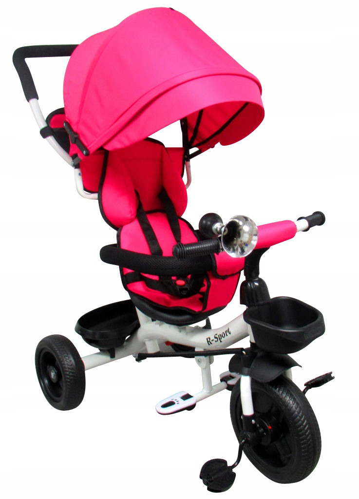 1. Rowerek z pełnym wyposażeniem: Budka chroni przed słońcem, poręcze i pasy zabezpieczają dziecko, rodzic steruje tylną rączką (rączka steruje kierownicą dzięki czemu rowerek jest skrętny),