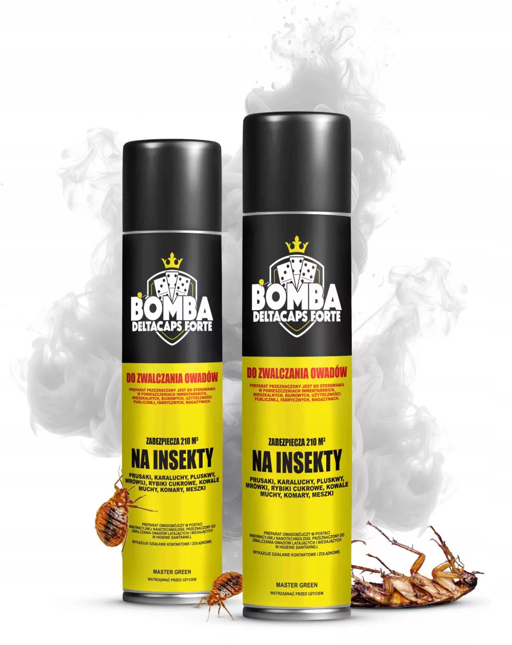 DELTACAPS FORTE to gotowy do użycia, mocny preparat owadobójczy w formie bomby zamgławiającej - przeznaczony do zwalczania owadów biegających w higienie sanitarnej, m.in. prusaków, karaluchów, rybików, mrówek, much i innych. Szczególnie polecany do zwalczania pluskiew domowych, wykazuje szybkie i silnie działanie pokarmowe i kontaktowe (po 2 godz. od zastosowania). Produkt zawiera substancję czynną pochodzenia naturalnego -  wyciąg z otwartych i dojrzałych kwiatów wrotyczu dalmatyńskiego. Zawartość pojemnika wystarcza na 210 m3 kubatury powierzchni (ok. 80 m²) poddawanej zabiegowi dezynsekcji.