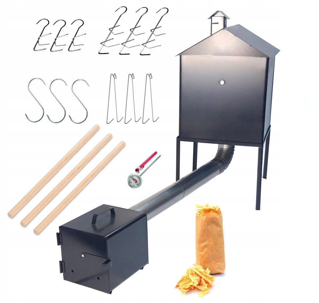 Przedmiotem sprzedaży jest solidna metalowa wędzarnia ogrodowa wykonana z grubej czarnej blachy, wędzarnia z zewnątrz jest pokryta lakierem odpornym na temperaturę i warunki atmosferyczne. W kominie wędzarni został zamontowany szyber dzięki czemu to my decydujemy ile ma pozostać dymu w komorze wędzarni. Wędzarnia została tak zaprojektowana że po zakończeniu wędzenia możemy ją bardzo łatwo i szybko złożyć dlatego przechowywanie jej nie sprawia problemu. Wędzarnia jest wyposażona w termometr który ułatwia proces wędzenia poprzez kontrolowanie temperatury.