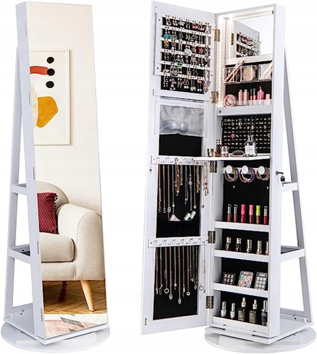 120 przegródek na kolczyki, 1 obliczenie na zamku, 24 haczyki na naszyjniki, 1 ukryta skala, 3 zdemontowane akrylowe, 12 uchwytów na szminki, 104 przegródek na pierścionki, 1 składana platforma, 3 drążki na skrzydła i 2-poziomowy elementy, ta zamykana szafka na przechowywanie zapewnia miejsce przechowywania sprzętu i kosmetyków.