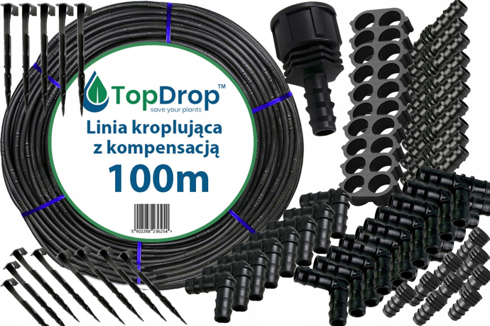 Linia kroplująca (wąż kroplujący) TOP DROP z kompensacją 100m 2L/h 16mm + 36 szt. AKCESORIÓW