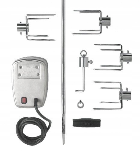 W skład zestawu wchodzą pręt rożna na który nabijamy np kurczaka, uchwyty czyli szpilki które unieruchomią grillowaną potrawę tak aby obracała się razem z rożnem, elektryczny napęd oraz odważnik który ma za zadanie wyważenie obracającej się potrawy.