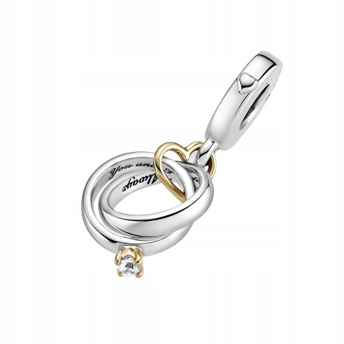 Na sercu z emalii zawieszone są dwie splecione obrączki: jedna to pierścionek solitaire z lśniącym kamieniem, a druga – smukła obrączka ze srebra. Po ich wewnętrznej stronie wygrawerowano napisy „You and I” oraz „Forever and always”.