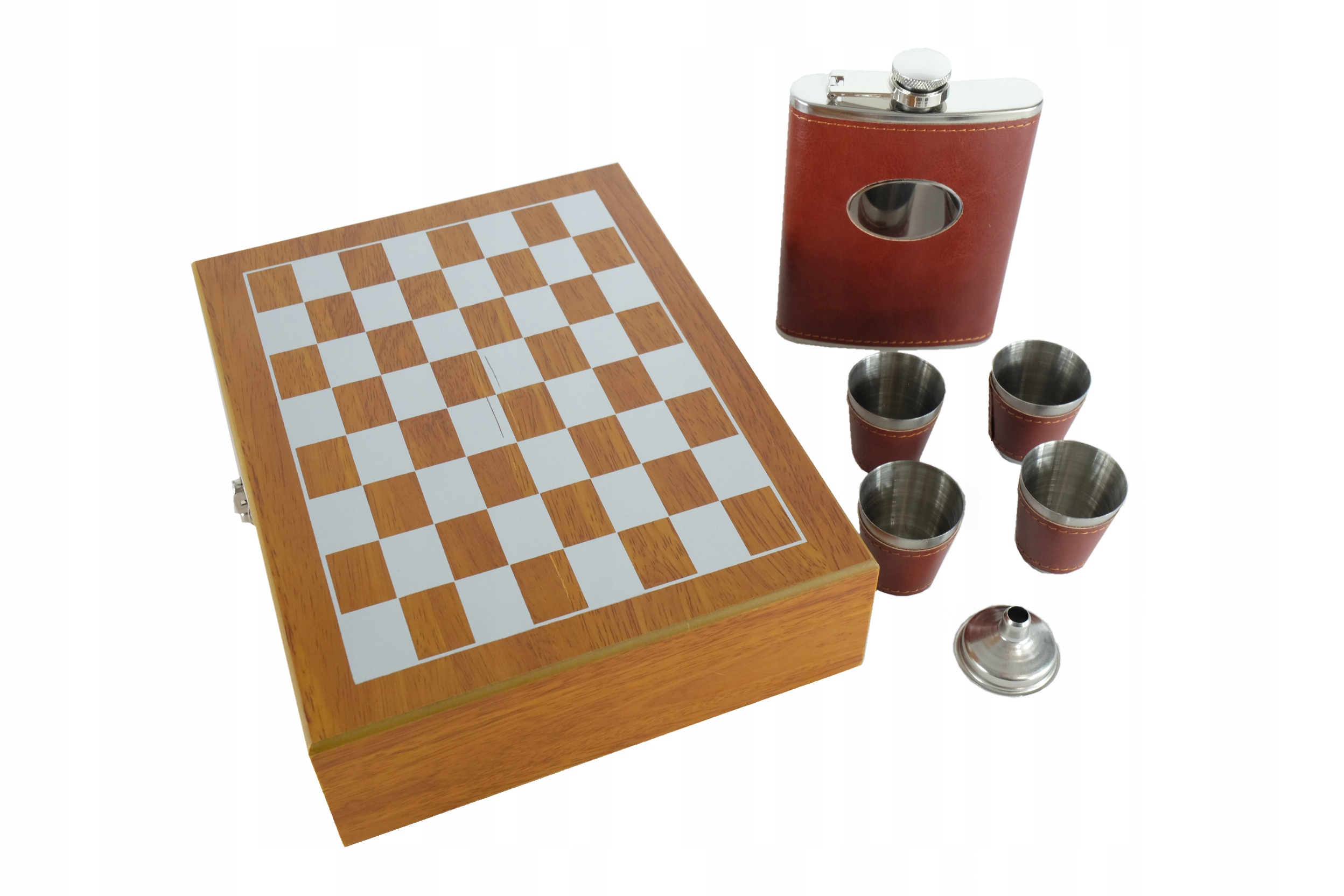 Wyjątkowy i elegancko wykonany zestaw, składający się z  piersiówki, kieliszków wraz akcesoriami oraz szachownicą.