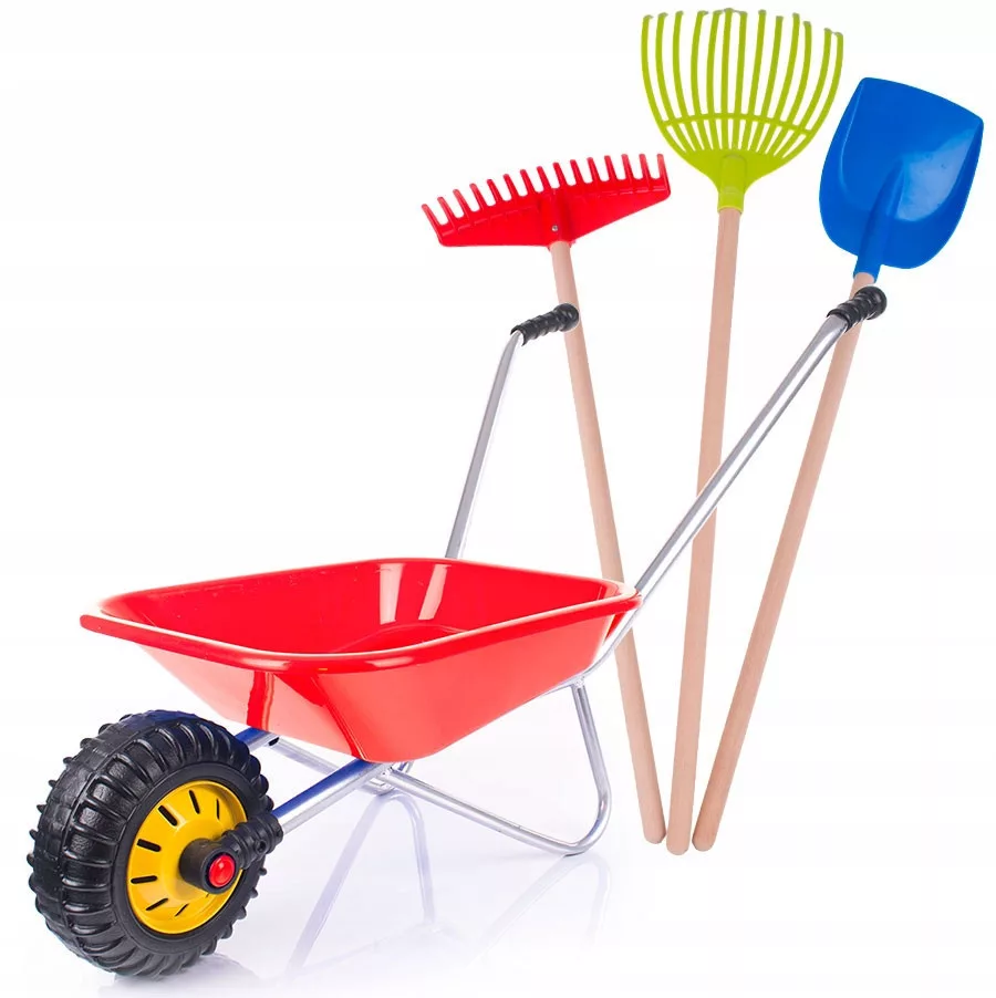 SKŁAD ZESTAWU: TACZKI DZIECIĘCE (z elementami metalowymi) + NARZĘDZIA (grabki zwykłe, grabki do liści oraz łopata)