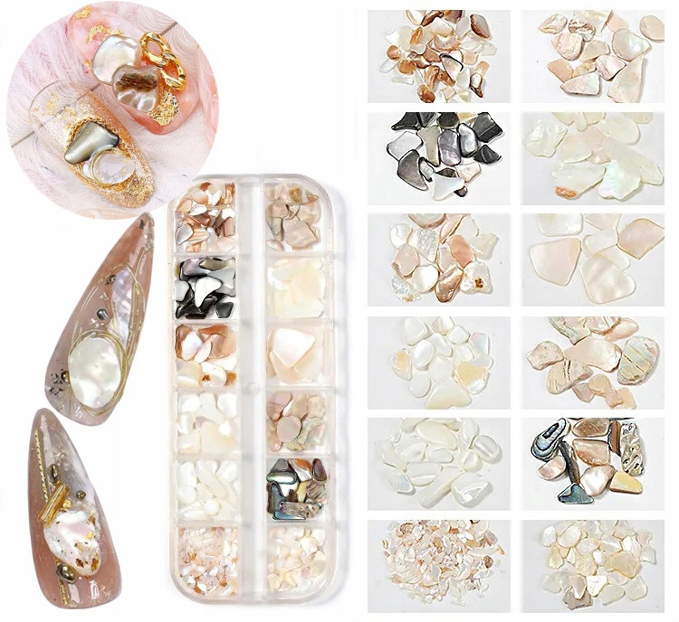 Zestaw różnorodnych ozdób do paznokci, które urozmaicą każdy manicure. W skład zestawu wchodzą naturalne kawałki muszli oraz złote ozdoby. Pięknie błyszczące, o nieregularnych kształtach. Możesz je zatopić w żelu lub przykleić na klej do tipsów. Całość zamknięta jest w wygodnym pudełku z dwunastoma przegródkami. Większe kawałki muszli możesz bez problemu połamać na mniejsze kawałki aby dostosować ich wielkość do płytki paznokcia i stylizacji jaką chcesz osiągnąć.
