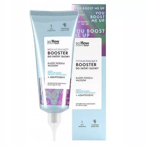 Booster do skóry głowy so!flow regeneruje, wzmacnia i przyspiesza porost włosów. Zawarty w składzie olej z czarnuszki wpływa łagodząco na podrażnienia oraz przyspiesza naturalną regenerację skóry głowy. Kompleks biotyny z mocznikiem zapobiega wypadaniu włosów, a aloes stymuluje ich wzrost i przywraca skórze komfort. W składzie znalazł się również ekstrakt z palmy sabałowej, który zwiększa elastyczność skóry i poprawia jej funkcje ochronne. Booster nawilża, wzmacnia i odżywia skórę głowy, dzięki czemu włosy stają się mocniejsze i pełne blasku.
