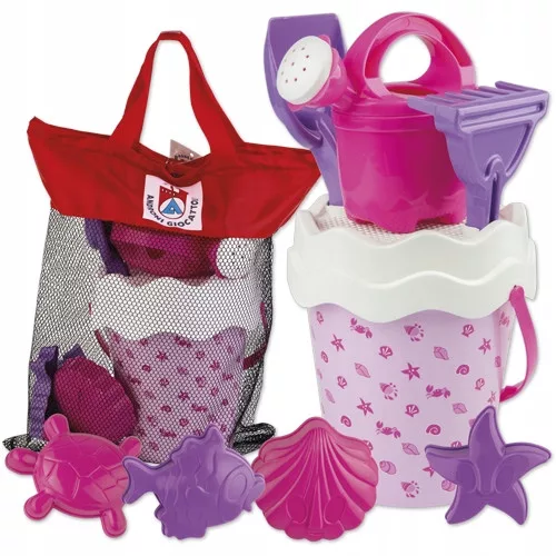Zabawki do piasku od firmy Androni Giocattoli to wspaniały zestaw dla dzieci lubiących zabawę w piasku. Wiaderko, grabki, łopatka i konewka oraz foremki w odcieniach różowego to idealny zestaw dla dziewczynek. Pozwala na fantastyczną zabawę w piaskownicy i na plaży. Wysoka jakość wykonania i użytych materiałów pozwala na długą i zajmująca zabawę. Zestaw zabawek plażowych z wiaderkiem i foremkami to niezbędne wyposażenie podczas wakacji nad morzem. Całość została spakowana w praktyczną, zamykaną na suwak siatkę z rączką, co pozwala na łatwe przechowywanie i przenoszenie zestawu.