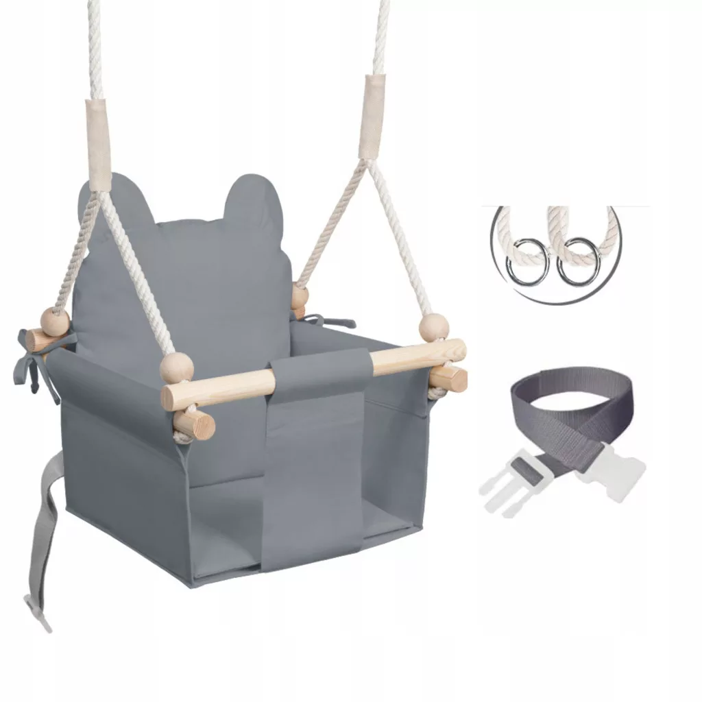 Huśtawka dla dzieci do domu i ogrodu w stylu skandynawskim z poduszkami i koralami w kolorze - SZARYM ORAZ PASEM W ODCIENIU SZARYM.