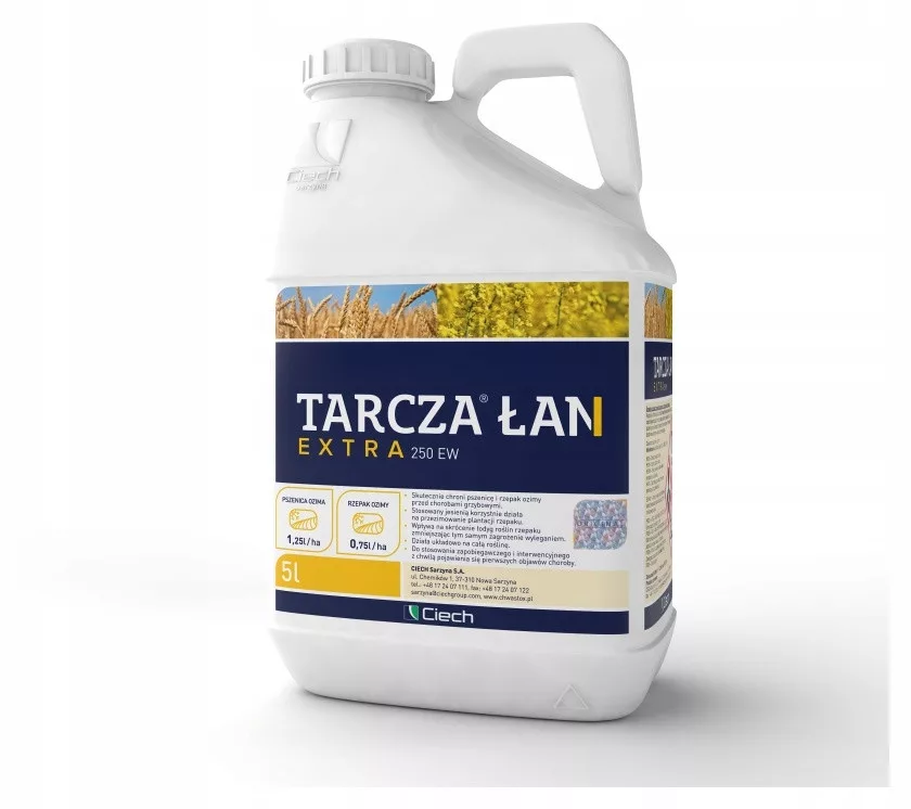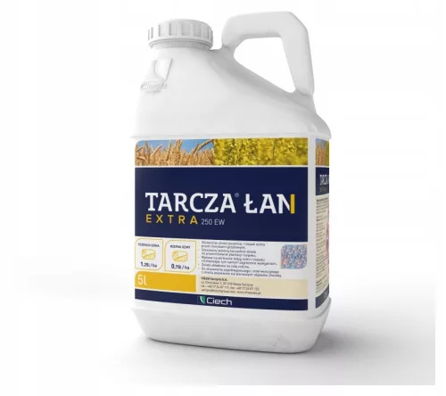 Tarcza Łan Extra 250 EW to fungicyd w formie płynu do sporządzania emulsji wodnej o działaniu układowym do stosowania zapobiegawczego lub z chwilą pojawienia się pierwszych objawów choroby w ochronie pszenicy ozimej i rzepaku ozimego przed chorobami grzybowymi. Środek wykazuje dodatkowo korzystny wpływ na rozwój roślin rzepaku.Środek przeznaczony do stosowania przy użyciu samobieżnych lub ciągnikowych opryskiwaczy polowych.