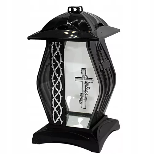 Moderne Kerzenlaterne mit Dornen- und Kreuzmotiv in Schwarz und Silber LL23