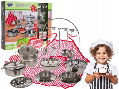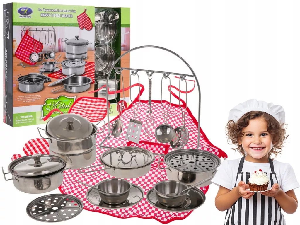 Zestaw składa się z wielu elementów niezbędnych w każdej dziecięcej kuchni. Są tu garnki z pokrywkami, przybory kuchenne, fartuszek kucharza, rękawica, talerze, łyżeczki...