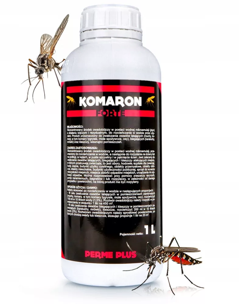 Oprysk na komary KOMARON FORTE to potężny koncentrat owadobójczy, opracowany specjalnie do zwalczania różnorodnych gatunków owadów takich jak komary, muchy i meszki oraz mrówki, kleszcze i karaluchy. Środek na komary dzięki innowacyjnej formule w postaci wodnej mikroemulsji działa szybko i skutecznie, eliminując problem insektów latających i biegających. Koncentrat jest łatwy w użyciu i wymaga jedynie rozcieńczenia z wodą przed aplikacją, a użytkownik ma możliwość dostosowania stężenia roztworu do konkretnych gatunków owadów i warunków otoczenia.