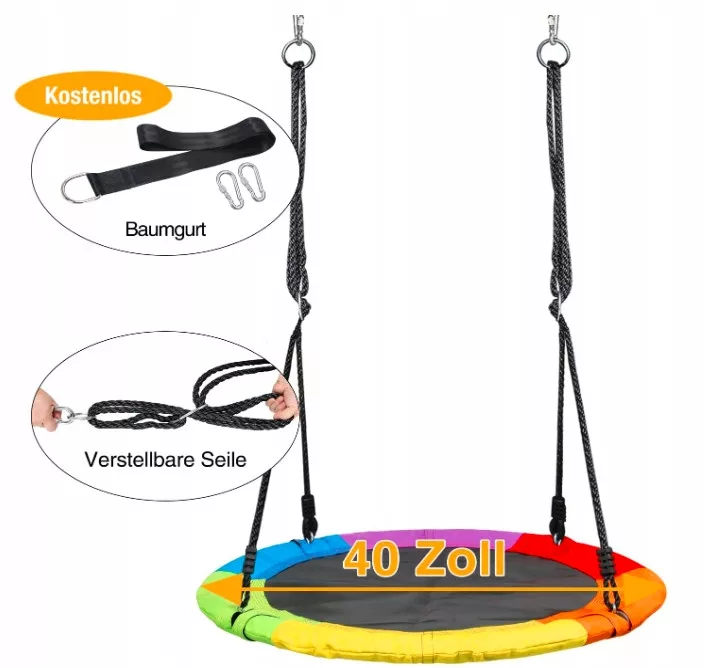 • Wytrzymała i duża huśtawka: duża rama stalowa 100 cm z ciasno tkanym siedziskiem z tkaniny tekstylnej dla 3 dzieci lub dwojga dorosłych. Waga do 300 kg, bezpieczna dla dzieci, które chcą długo kołysać się na świeżym powietrzu.
