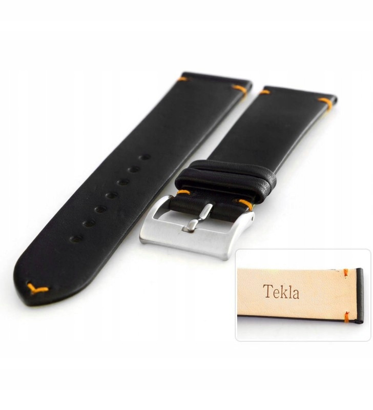 Pasek do zegarka firm Tekla w kolorze Czarnym, wykonany z ze skóry cielęcej, bardzo miłej przyjemnej w dotyku. Pasek przeszyty jest z boku jak i na czubku paska nicią w kolorze pomarańczowym. W pasku osadzono stalową klamerkę - sprzączkę w kolorze srebrnym.