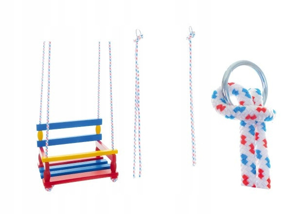 Piękna drewniana kolorowa huśtawka. Nadaje się do użytku w domu i ogrodzie. Huśtawka jest bezpieczna i stabilna.