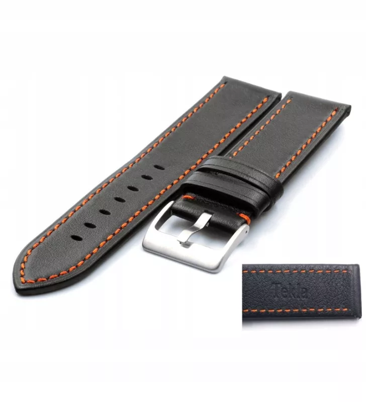 Pasek do zegarka firm Tekla w kolorze Czarnym z pomarańczowym przeszyciem, wykonany z ze skóry cielęcej, bardzo miłej przyjemnej w dotyku. Pasek przeszyty jest nicią w kolorze Czarnym. W pasku osadzono stalową klamerkę - sprzączkę w kolorze srebrnym.