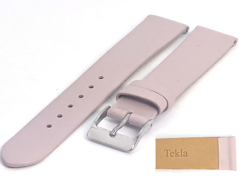 Pasek do zegarka firm Tekla w kolorze Różowym, wykonany z ze skóry cielęcej, bardzo miłej przyjemnej w dotyku. W pasku osadzono stalową klamerkę - sprzączkę w kolorze srebrnym. Pasek na całej długości ma  tą samą grubość.