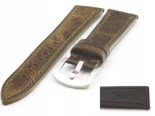 Pasek do zegarka firm Tekla w kolorze zielono-brązowym, wykonany z ze skóry cielęcej, bardzo miłej przyjemnej w dotyku. Pasek przeszyty jest nicią w kolorze zielonym. W pasku osadzono stalową masywną klamerkę - sprzączkę w kolorze srebrnym. Pasek zwęża się o 2 mm przy klamerce.