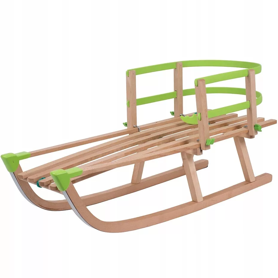 Dane techniczne: model: z oparciem, materiał: szczebelki drewniane, wiek: 3+, długość sanek: 90 cm., szerokość siedziska: 32 cm., wysokość sanek: 22 cm., wysokość z oparciem: 41 cm., maksymalne obciążenie: 50 kg.