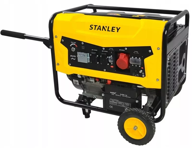 Generator prądotwórczy STANLEY. Napięcie 230V/400V , Moc znamionowa 3000W/6800W , moc maksymalna 3400/7500W. System stabilizacji AVR . Silnik 4 suwowy , chłodzony powietrzem o pojemności 458 cm3 i mocy 18 KM przy prędkości obrotowej 3240 obr/min. Pojemność zbiornika paliwa 25 L , pojemnośc zbiornika oleju 1,1 L. Rozruch elektryczny za pomocą akumulatora 12V 17Ah . Miedziane uzwojenie prądnicy. Czas pracy ciagłej przy obciążeniu znamionowym około 8 godzin. Dwa gniazda 230V plus gniazdo 400V . Norma spalania EURO V . Koła transportowe , uchwyt transportowy.