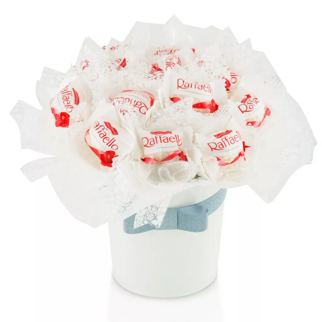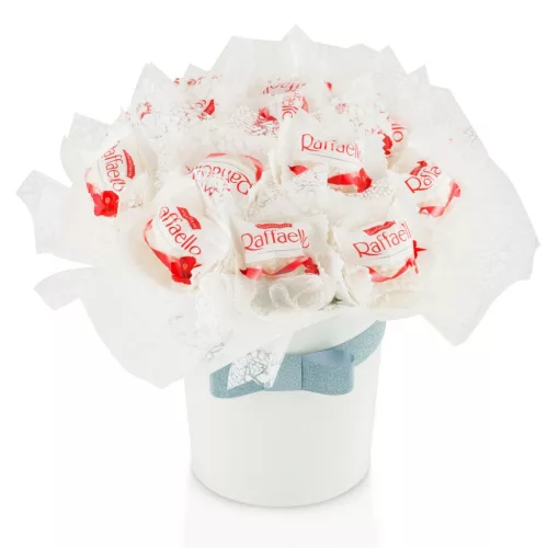 Najsłodszy prezent jaki podarujesz Swojej Walentynce! Niezwykły słodki bukiet z 16 pralin Raffaello, który zaskoczy i wzruszy. Możesz go wręczyć osobiście albo wysłać za naszym pośrednictwem bezpośrednio do bliskiej Ci osoby na wybrany dzień.