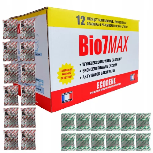 Oferujemy Państwu Bio7 MAX - rewolucyjny preparat, który zadba o optymalną pracę każdej oczyszczalni przydomowej! Zestaw 12 saszetek zapewnia aż 12 miesięcy bezproblemowej eksploatacji dla oczyszczalni o pojemności do 3000 litrów.