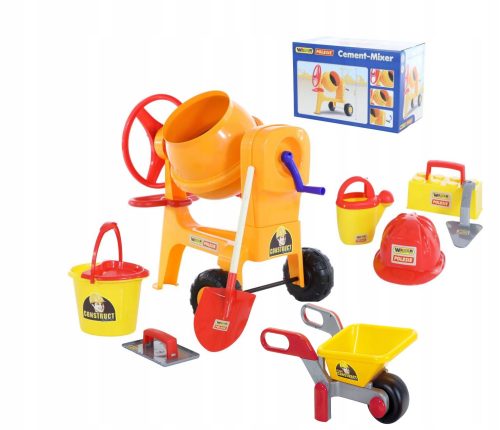 od firmy POLESIE . Jest duża (jej wysokość to 67 cm), posiada duży bęben i można w nim mieszać przeróżne składniki w sporych ilościach. Kręcenie korbą sprawia, że bęben się obraca a wraz z nim wszystko co w środku umieszczono. Dzięki specjalnemu uchwytowi bęben betoniarki można przechylać, co umożliwi jej łatwe opróżnienie. Zabawka posiada dwa szerokie koła. Pozwala to na jej sprawne transportowanie.