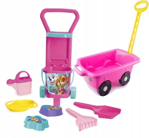 Wózek z kompletem letnim z bohaterami bajki PSI PATROL to niezbędnik każdego małego turysty. Komplet zawiera wiaderko z sitkiem, łopatkę, grabki, konewkę i dwie foremki. Zestaw zabawek umieszczony jest w praktycznym wózku, który ułatwia transport i pomaga utrzymać porządek po zakończonej zabawie. Jest lekki i wytrzymały, dzięki temu może towarzyszyć naszym milusińskim zarówno podczas wyjazdu na wakacje nad morze, czy też wyprawy do piaskownicy, parku czy ogrodu. Wózek na kółkach umożliwia przemieszczanie się z zabawkami w łatwy sposób nawet dla najmłodszych dzieci. Zestaw daje możliwość nieograniczonej zabawy – tworzenia budowli z piasku, kopania tunelu, grabienia liści, zbierania muszelek czy przesiewania piasku. Zabawa z wykorzystaniem wózka rozwija kreatywność i wyobraźnię naszych pociech, wspiera rozwój ich umiejętności motorycznych, manualnych i koordynacji wzrokowo-ruchowej. Zapraszając rówieśników do wspólnej zabawy dziecko rozwija swoje kompetencje społeczne, umiejętności interpersonalne oraz uczy się współdziałania. Wszystkie elementy zestawu wykonane są z atestowanego, najwyższej jakości, bezpiecznego dla dzieci tworzywa sztucznego. Całość jest starannie wykończona i wytrzymała, a grafika wykonana metodą IML jest odporna na działanie wody i słońca. To pozwoli zabawkom wyglądać atrakcyjnie przez wiele sezonów.