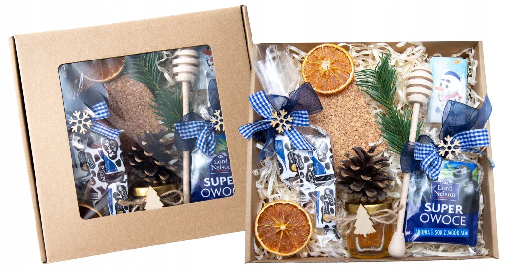 - pudełko typu gify-box z okienkiem z wypełnieniem w wełny drzewnej (wym. 20x20x5cm)