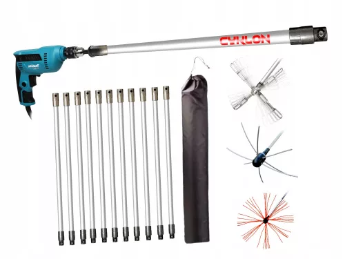 Zestaw Turboklik składa się z 9 sztuk elastycznych, nylonowych przedłużek ( każda o długości 1m ) zakończonych specjalnymi metalowymi końcówkami, głowicy łańcuchowej do usuwania najtwardszych zabrudzeń, szczotki z nylonowym włosiem oraz z adaptera, dzięki któremu podłączysz zestaw do wiertarki. Przedłużki łączą się ze sobą za pomocą specjalnego systemu klik-klik. Jest to bardzo wygodne i szybkie łączenie. Dzięki temu że jest to łączenie na szybkozłącze, można zestawem Turboklik obracać i w lewo i w prawo. Zestaw zawsze jest solidnie połączony i nie rozłącza się w kominie. Dodatkowo w zestawie jest pokrowiec do przechowywania oraz transportu zestawu CYKLON.