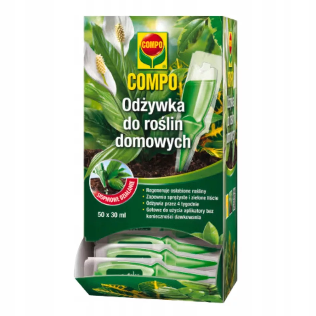 Specjalistyczna odżywka w formie aplikatorów marki Compo, przeznaczona do regeneracji i poprawy kondycji wszystkich gatunków roślin zielonych, takich jak monstera, dracena, palma czy juka. Dzięki gotowej do użycia formule wzmacnia system korzeniowy, poprawia kondycję roślin, zapewnia prawidłowo wybarwione liście i działa przez 4 tygodnie.
