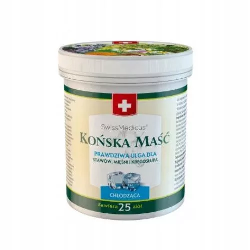 Końska maść SwissMedicus zapewnia ulgę dla zmęczonych mięśni, obolałych stawów i zmęczonego kręgosłupa. Końska Maść jest unikatowym balsamem ziołowym wyprodukowanym z 25 ekstraktów ziołowych i roślinnych na podstawie oryginalnej szwajcarskiej receptury. Zrównoważony skład substancji czynnych łączy w sobie kojący efekt zastosowania olejków eterycznych z pozytywnym wpływem wyciągów z ziół. Ekstrakty ziołowe i roślinne olejki eteryczne, zawarte w tych preparatach, spełniają surowe wymagania jakościowe, a testy przeprowadzane są na bieżąco przez wyspecjalizowanych pracowników z wieloletnim doświadczeniem w branży kosmetyki naturalnej.