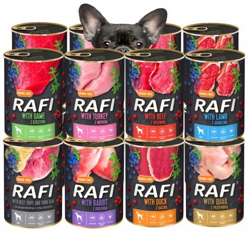 Pełnoporcjowe karmy pokrywające w 100% dzienne zapotrzebowanie na wszystkie składniki odżywcze, mineralne i witaminowe. Zapewniają odpowiednie zmineralizowanie kości i zębów oraz właściwy przebieg procesów metabolicznych. Receptura wolna jest od substancji konserwujących, barwników oraz aromatów poprawiających smak oraz stymulujących apetyt. Wykorzystanie mięsa i surowców pochodzenia zwierzęcego oraz ich precyzyjne zestawienie sprawiają, że produkty te są źródłem pełnowartościowego białka zawierającego wszystkie aminokwasy egzogenne. Dzięki nowoczesnej metodzie produkcji oraz starannej selekcji karmy Rafi odznaczają się wysokim współczynnikiem strawności.