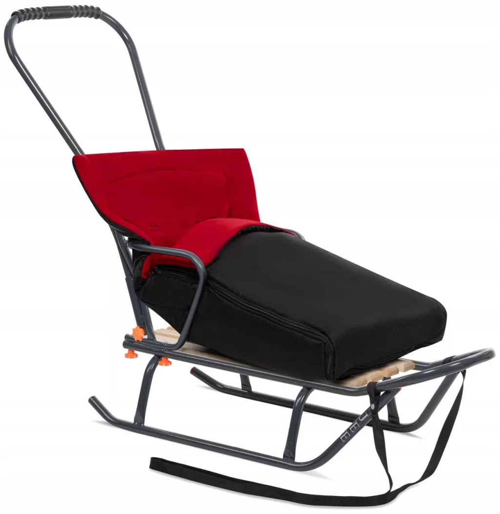 Sanki JEE M z oparciem, pchaczem i śpiworkiem dla dzieci i dorosłych.