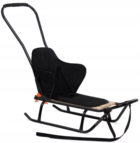 Sanki JEE M z oparciem, pchaczem i materacykiem dla dzieci.