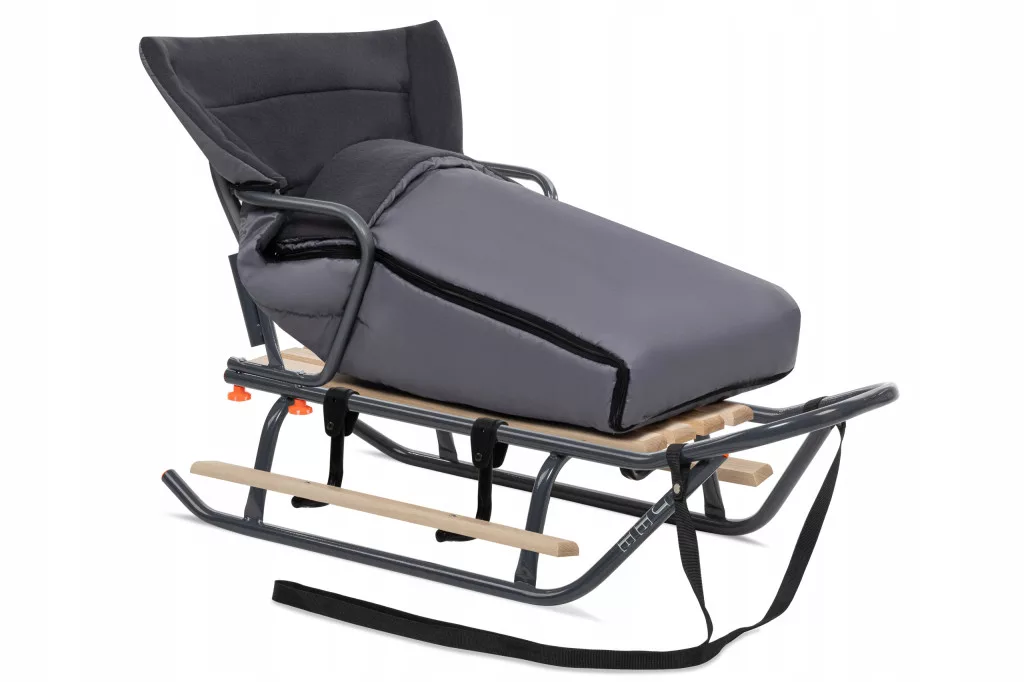 Sanki JEE M z oparciem, podnóżkami i śpiworkiem dla dzieci.