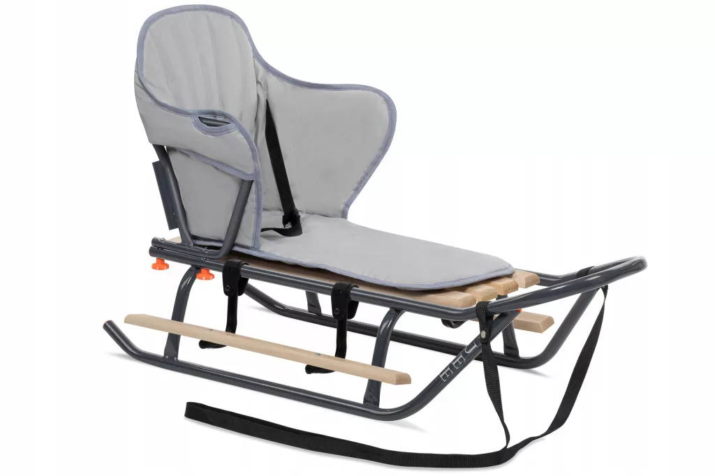 Sanki JEE M z oparciem, podnóżkami i materacykiem dla dzieci.