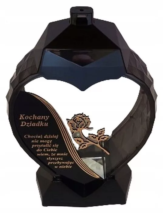 Eine große schwarz-goldene Kerze in Form eines Herzens mit einer Lilienblüte für Opa