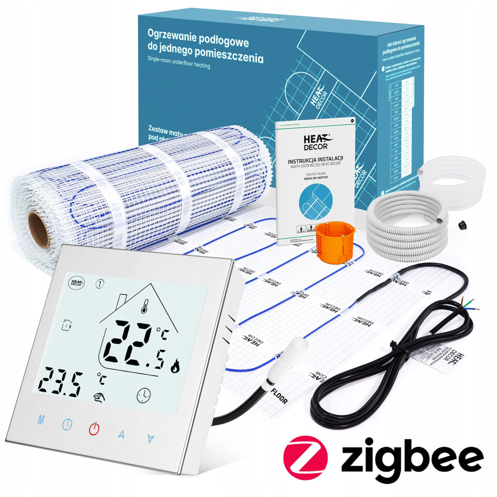 Mata grzewcza HD-MAT - zestaw ogrzewania podłogowego o powierzchni 3,5 m² producenta Heat Decor, moc 150 W/m², szerokość 50 cm, kabel grzejny z podwójną izolacją teflonem i bez pamięci kształtu, samoprzylepna siatka z włókna szklanego, z termostatem manualnym HD-T1000. W Wi-Fi, kolor biały.