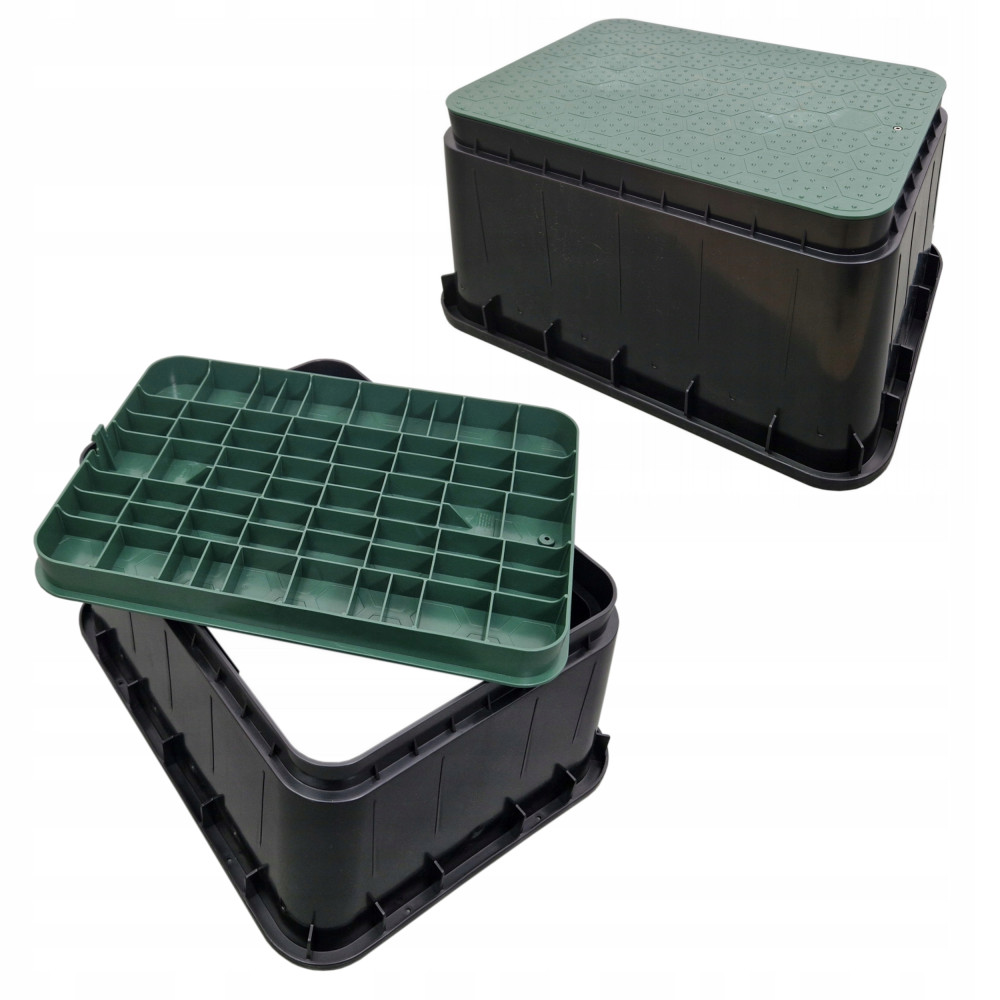 Studzienka zaworowa JUMBO jest prostokątną skrzynką bez dna, posiadająca nakładaną i dokręcaną pokrywę. Studzienka zapewnia łatwy dostęp do elektrycznych lub ręcznych zaworów stosowanych w systemach automatycznego nawadniania. Studzienki zaworowe zabezpieczają i chronią zawory przed ich uszkodzeniem.  Przeznaczona jest do stosowania w większych instalacjach ogrodowych oraz terenach użytku publicznego. Studzienka zaworowa JUMBO pozwala na umieszczenie w jej wnętrzu do 6 zaworów. Pokrywa studzienki została wykonana z tworzywa sztucznego (polietylenu PEHD) odpornego na warunki atmosferyczne, jak i promieniowanie UV.